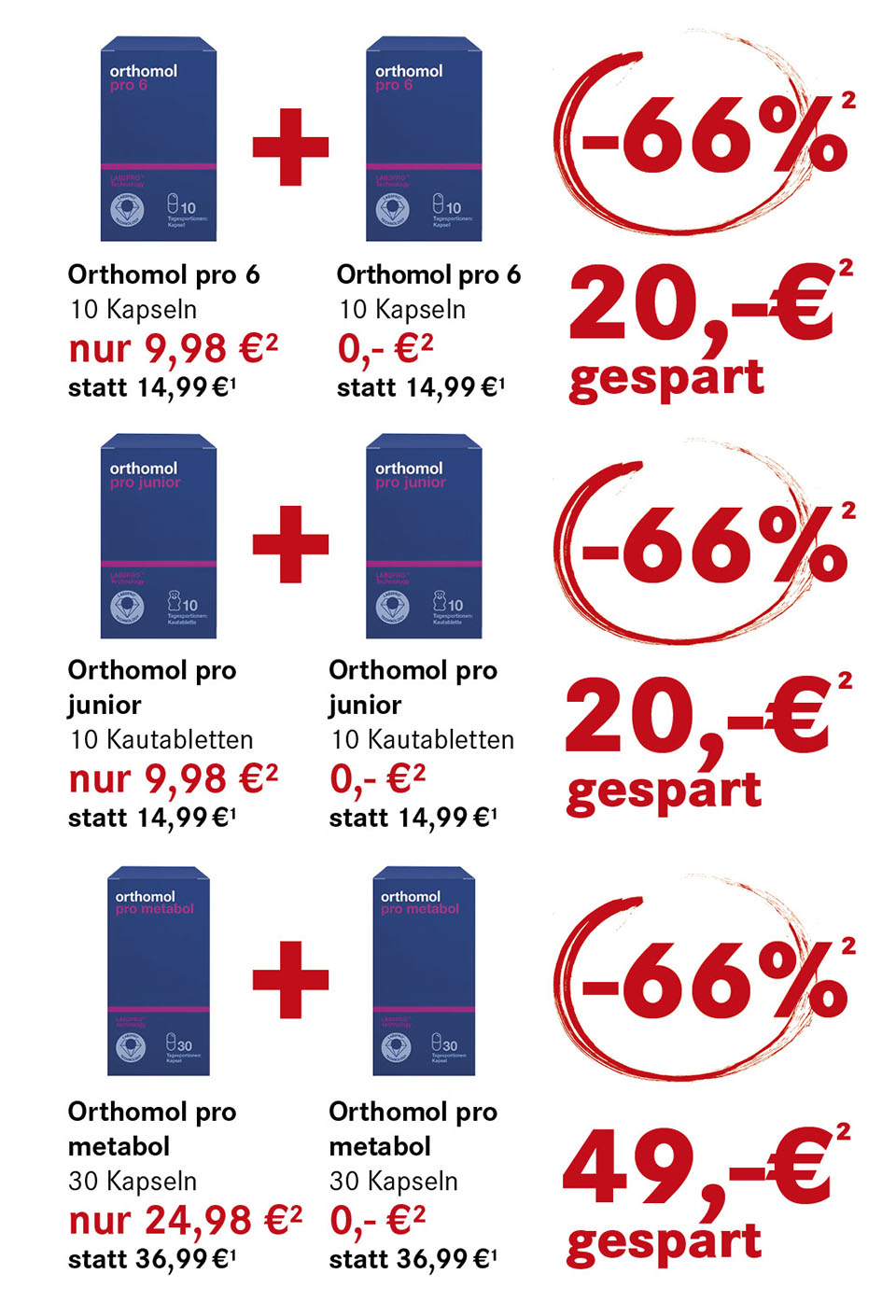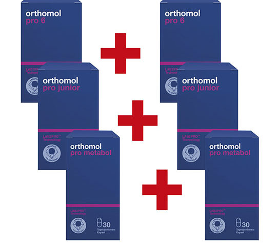 ¹ Unser unrabattierter Preis. (Stand: 16.01.2026) ² Die Aktion gilt nur für die Kundenkarteninhaber*innen in den Filialen sowie für die Nutzer*innen der App von die neue Apotheke „E-Rezept-Express“, nur solange der Vorrat reicht. Nicht mit anderen Rabatten kombinierbar. Beim Kauf einer Packung von Orthomol Pro 6 (PZN: 17839439) oder Orthomol Pro Junior (PZN: 18113130) , erhalten Sie jeweils eine weitere Packung (PZN 17839439 bzw. PZN 18113130) dazu; beim Kauf von Orthomol Pro Metabol (PZN: 18113153), erhalten Sie eine weitere Packung (PZN: 18113153) dazu. Max. 3 Packungen pro Artikel.