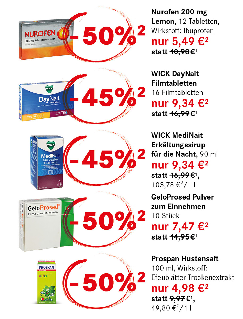 ² Die Aktion gilt nur für die Kundenkarteninhaber*innen in den Filialen sowie für die Nutzer*innen der App von DIE NEUE APOTHEKE „E-Rezept-Express“, nur solange der Vorrat reicht. Nicht mit anderen Rabatten kombinierbar. Max. 3 Packungen pro Medikament und Person.