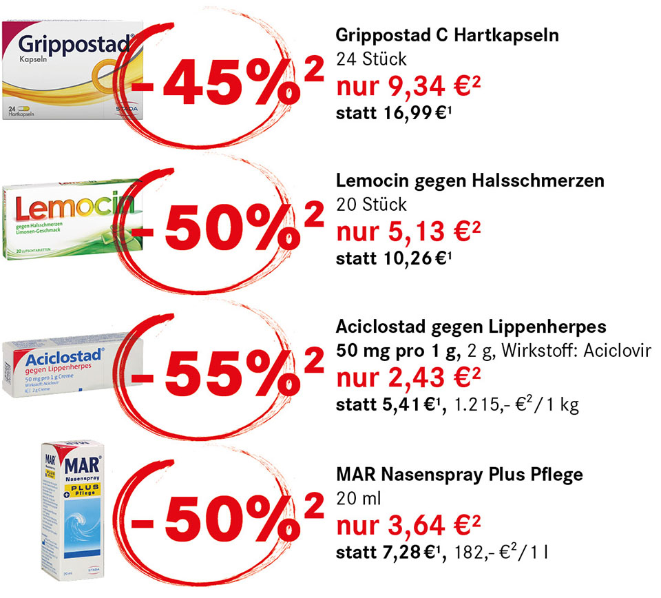 ² Die Aktion gilt nur für die Kundenkarteninhaber*innen in den Filialen sowie für die Nutzer*innen der App von DIE NEUE APOTHEKE „E-Rezept-Express“, nur solange der Vorrat reicht. Nicht mit anderen Rabatten kombinierbar. Max. 3 Packungen pro Medikament und Person.