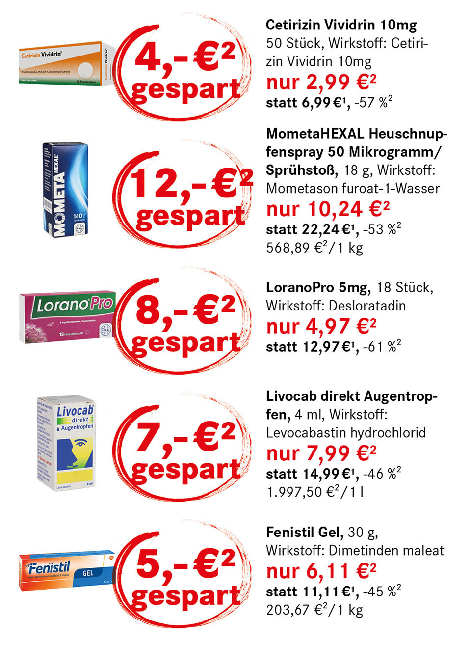 ² Die Aktion gilt nur für die Kundenkarteninhaber*innen in den Filialen sowie für die Nutzer*innen der App von DIE NEUE APOTHEKE „E-Rezept-Express“, nur solange der Vorrat reicht. Nicht mit anderen Rabatten kombinierbar. Max. 3 Packungen pro Medikament und Person.